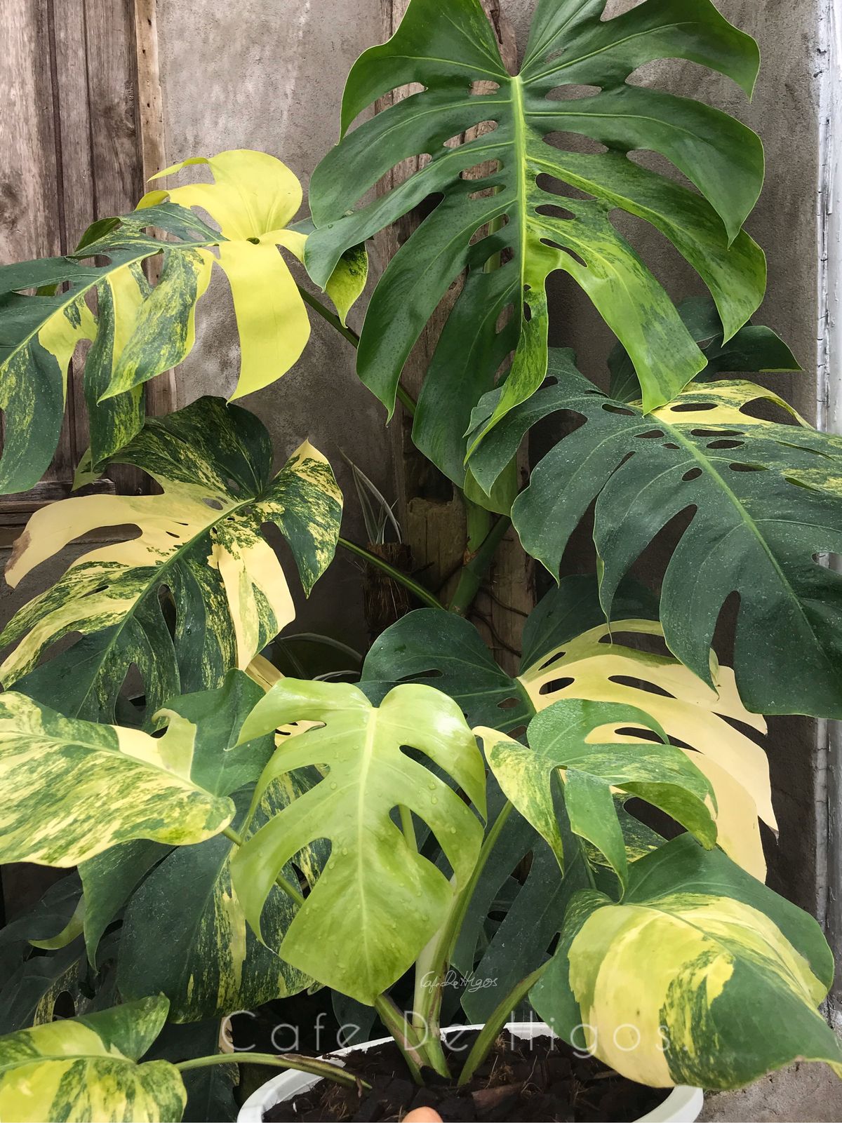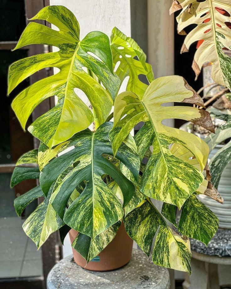 The Monstera Borsigiana Aurea is a rare, sought-after houseplant known for its glossy, heart-shaped leaves with striking yellow and green variegation. It has characteristic fenestrations (splits and holes) and an upward-climbing growth habit that can reach up to 2–3 meters tall.